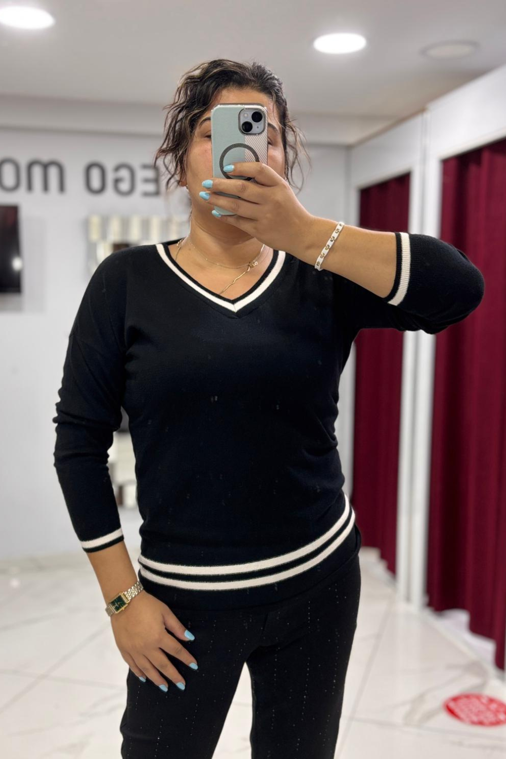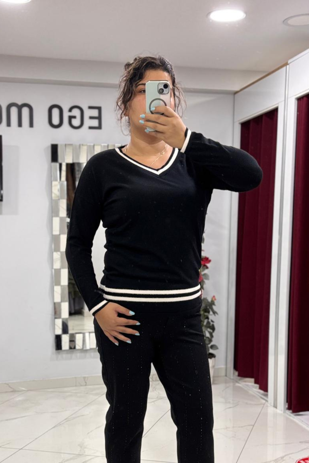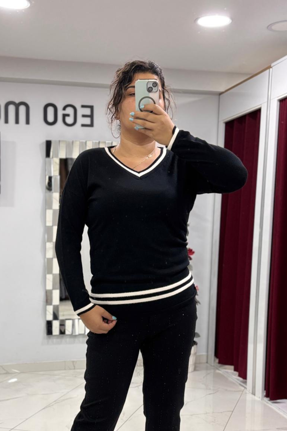 Detay: Yaka, bel ve kol uçlarında kontrast beyaz şerit detayı
