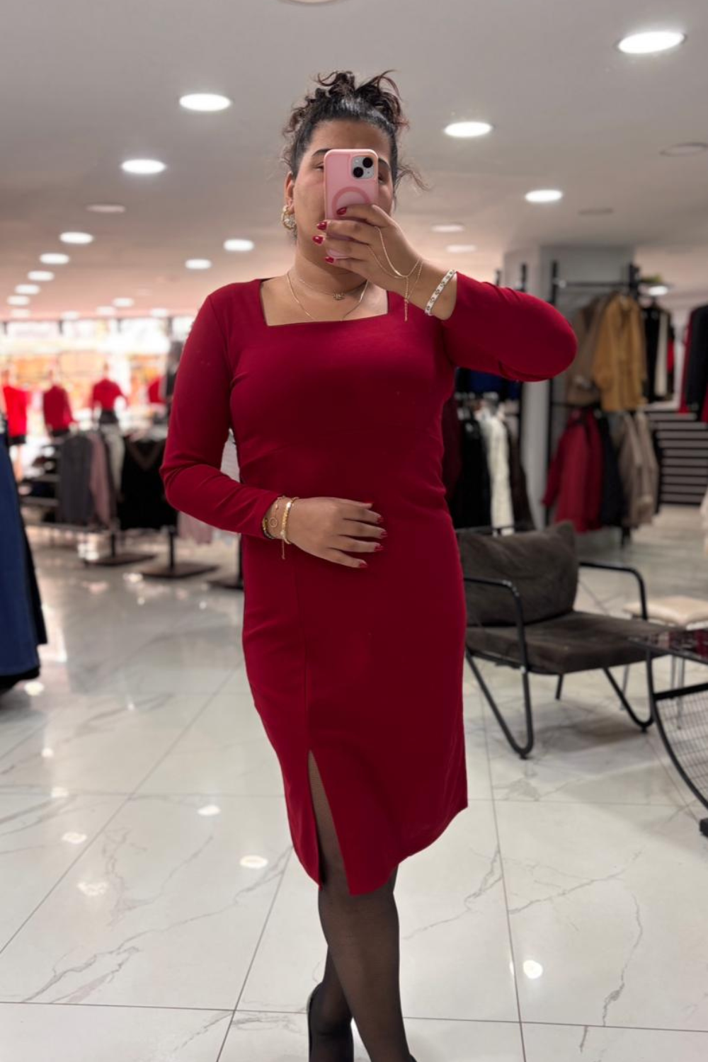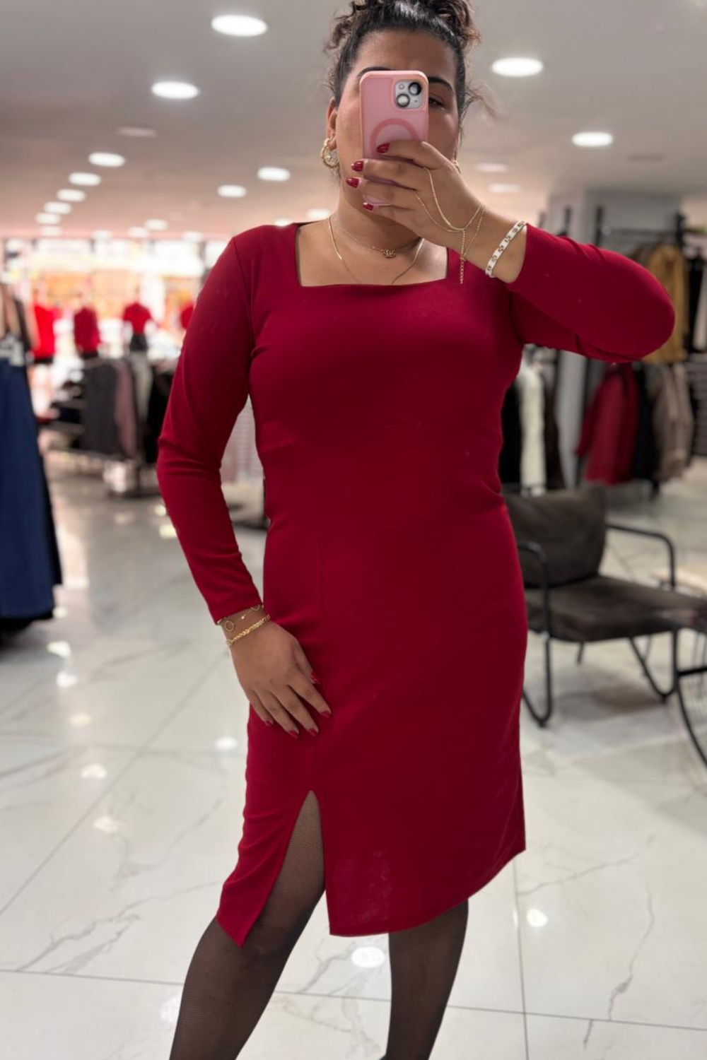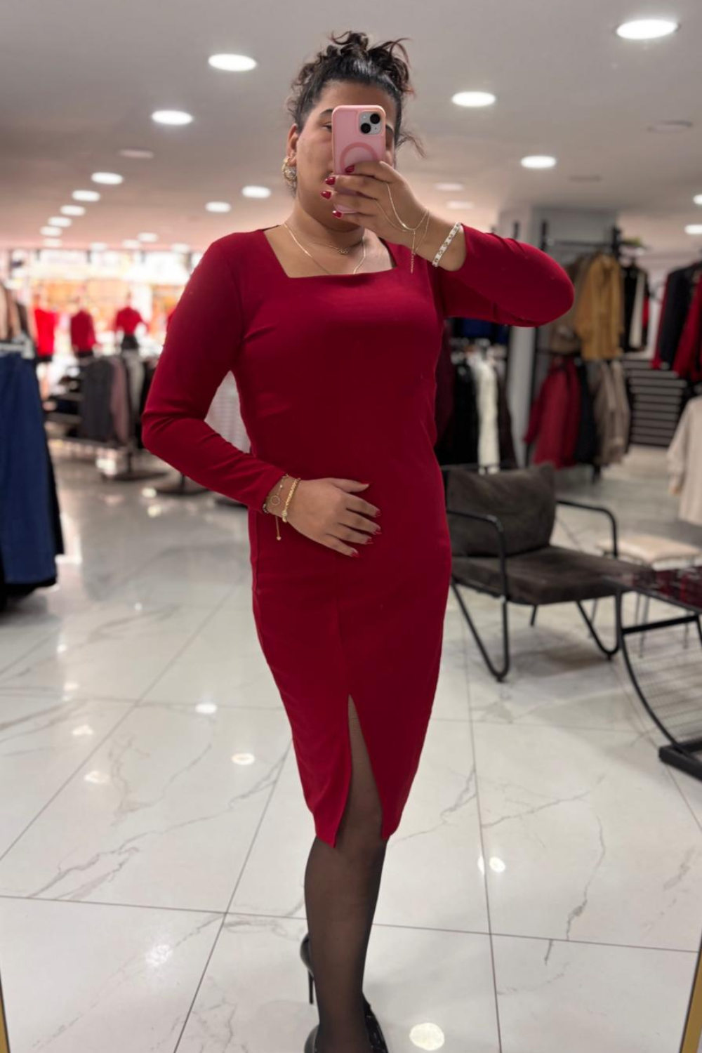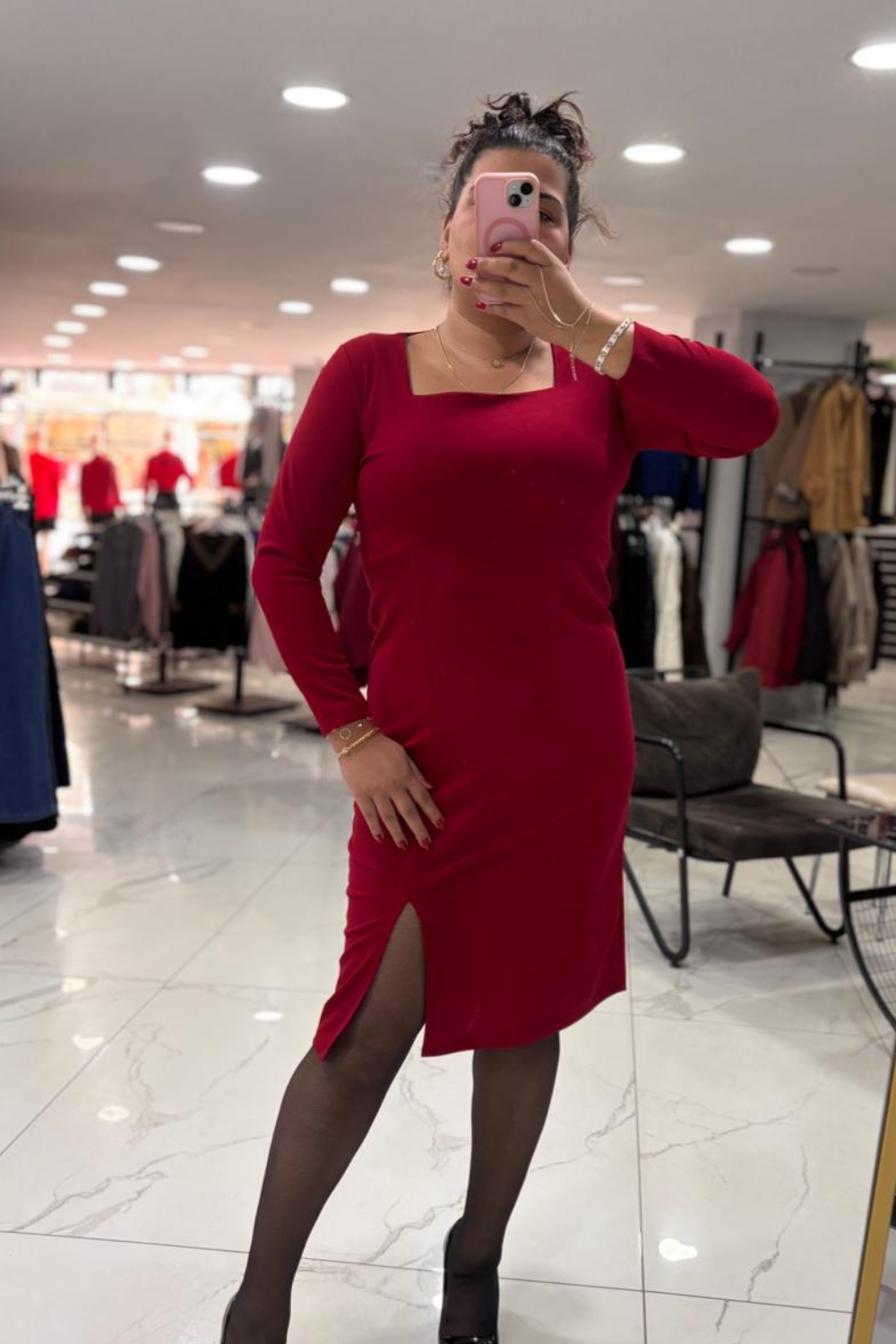 Zarif kare yaka detayı ve öndeki yırtmaç tasarımıyla feminen bir görünüm sunan bu elbise, sade şıklığıyla dikkat çeker.