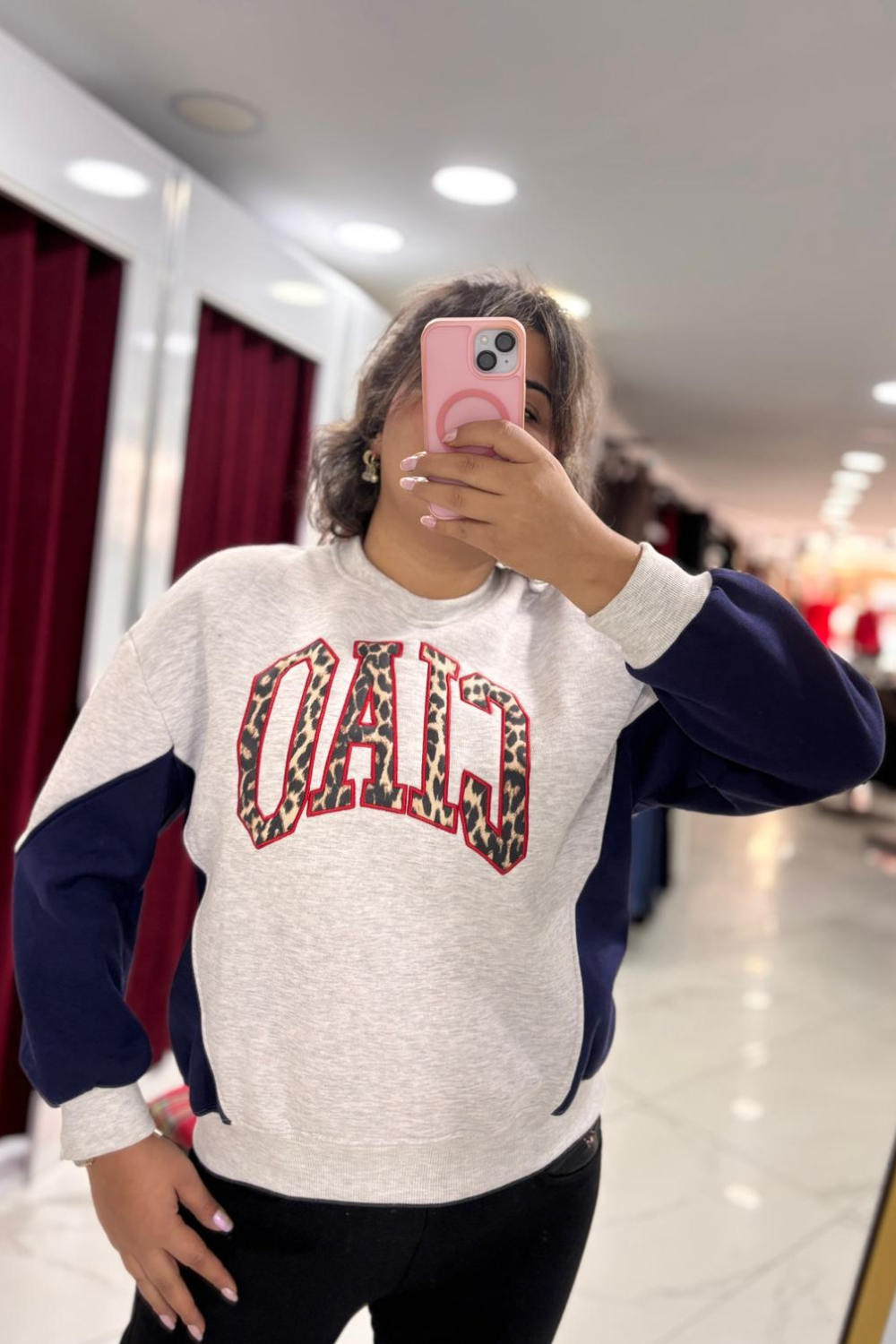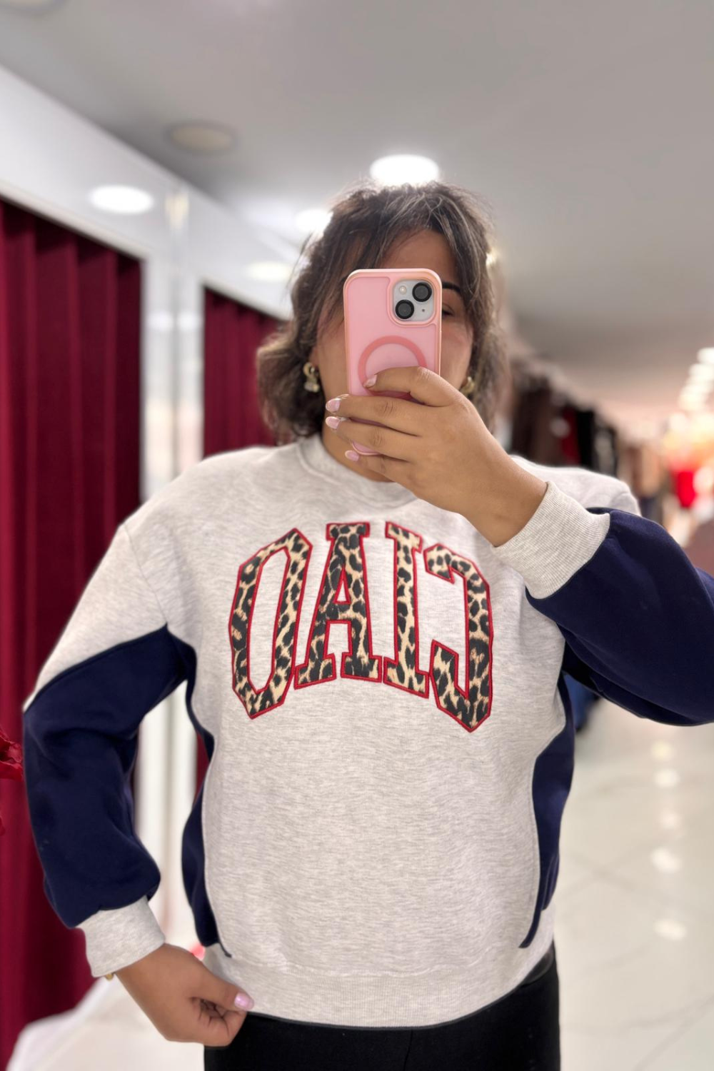 Detay: Leopar desenli “CIAO” baskı, iki renkli kol tasarımı