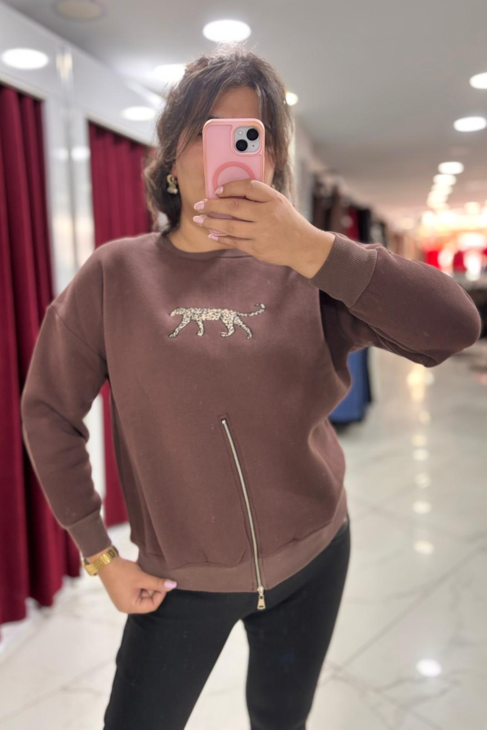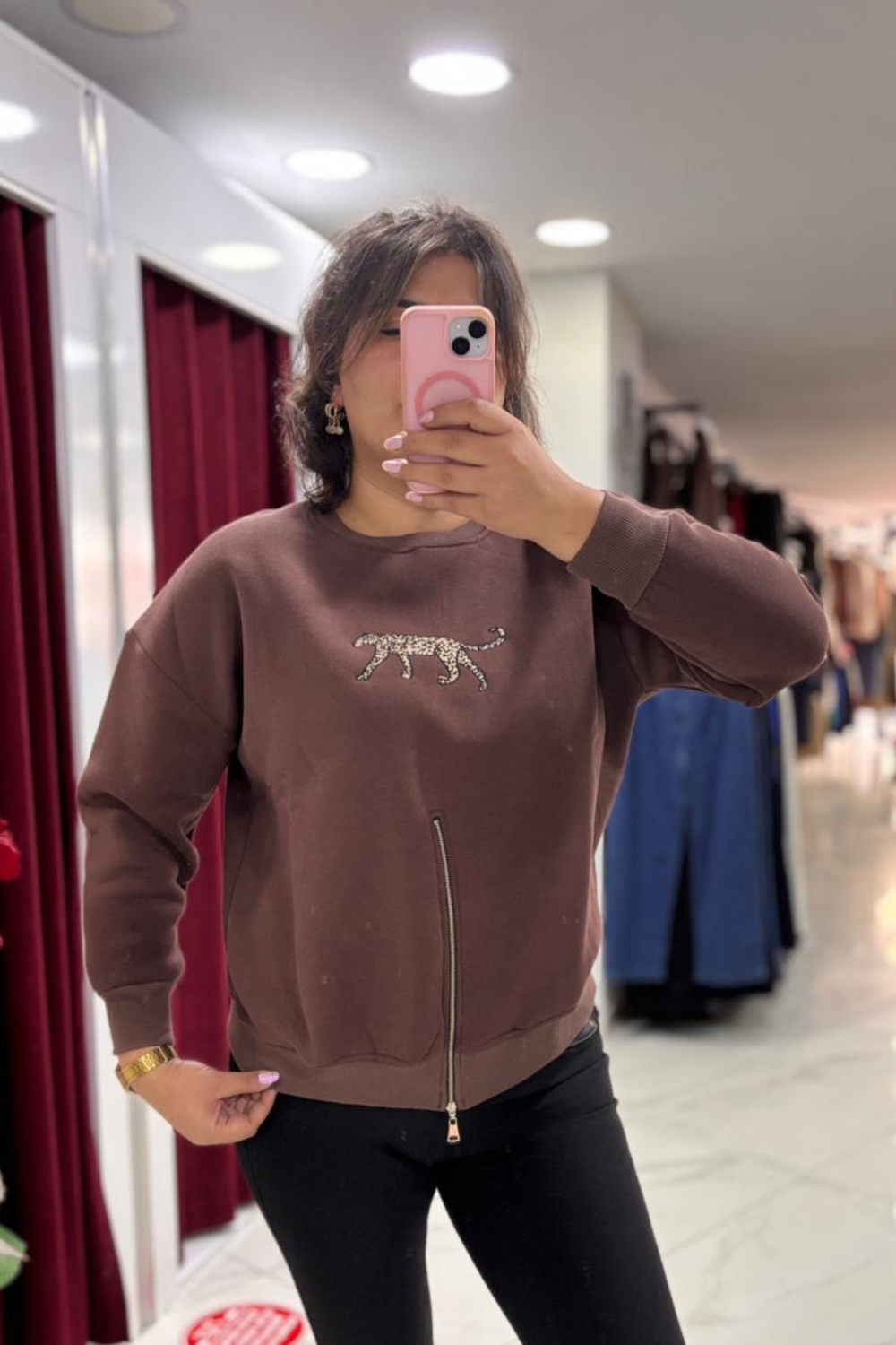 Leopar desenli panter detayı ve fermuar süslemeli tasarımıyla spor şıklığı bir arada sunar.