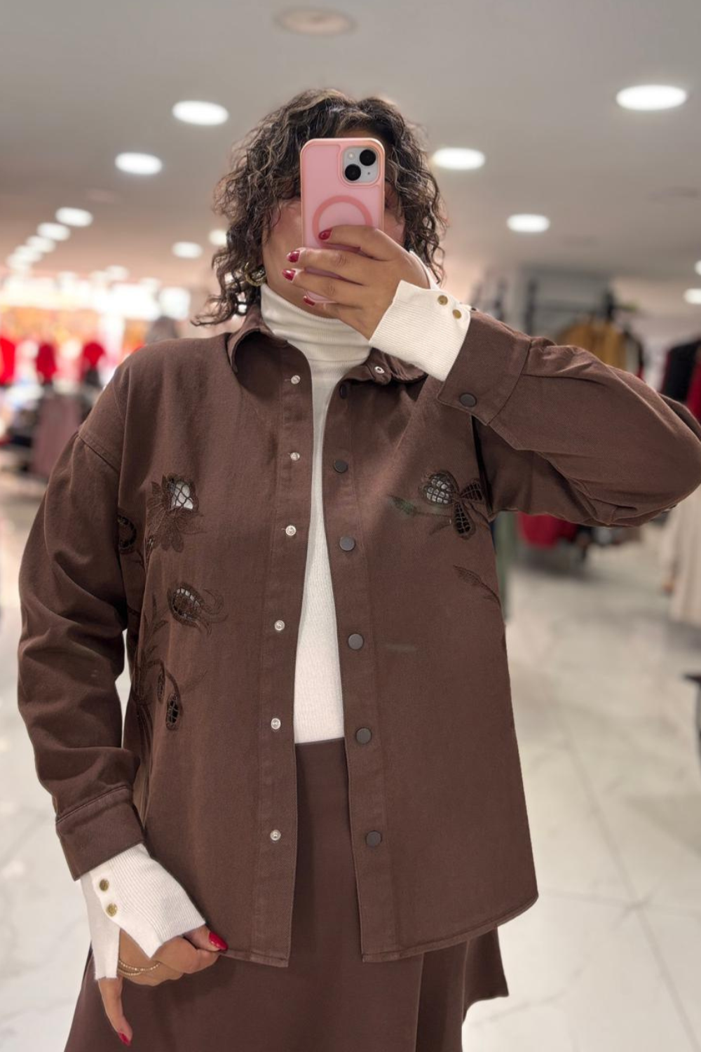 Doğal pamuk gabardin dokusu ve zarif işlemeleriyle dikkat çeken bu gömlek ceket, sonbahar ve kış aylarında şıklıkla rahatlığı bir arada sunar. Kaliteli kumaş yapısı sayesinde nefes alır, gündelik ve şık kombinlerde kolayca kullanılabilir.