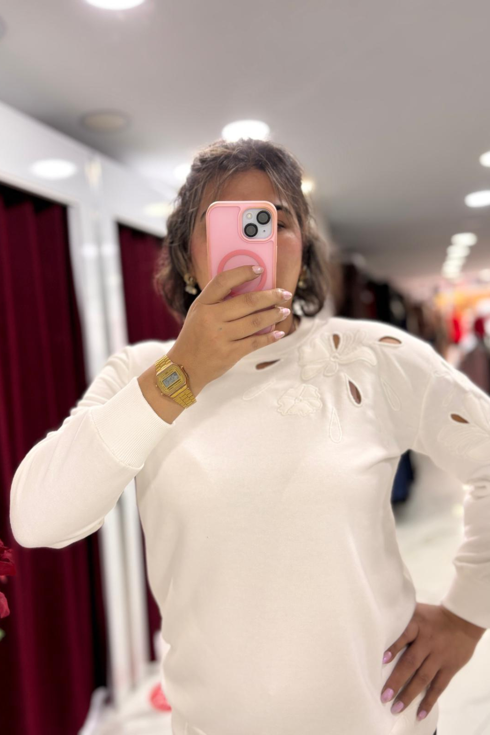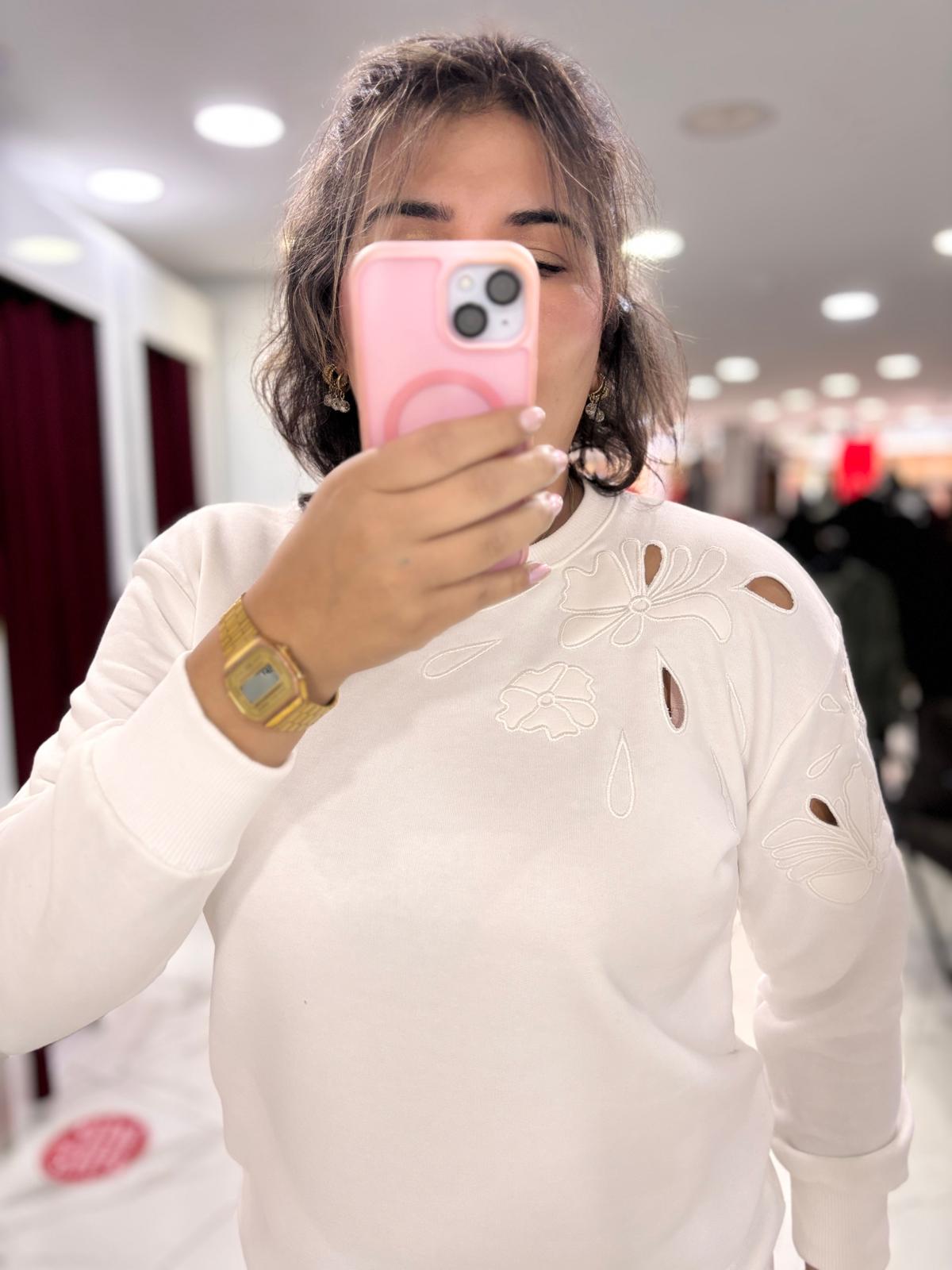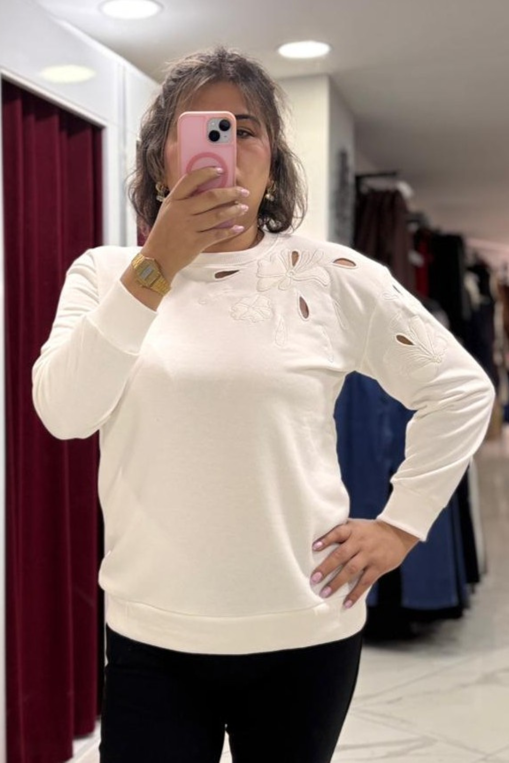 Zamansız lacivert tonuyla şıklığı ve rahatlığı bir arada sunan bu sweatshirt, omuz ve kol bölgesindeki taş detaylarıyla sade bir parçada zarafeti ön plana çıkarır. Günlük kullanımda hem konforlu hem göz alıcı bir görünüm sağlar.