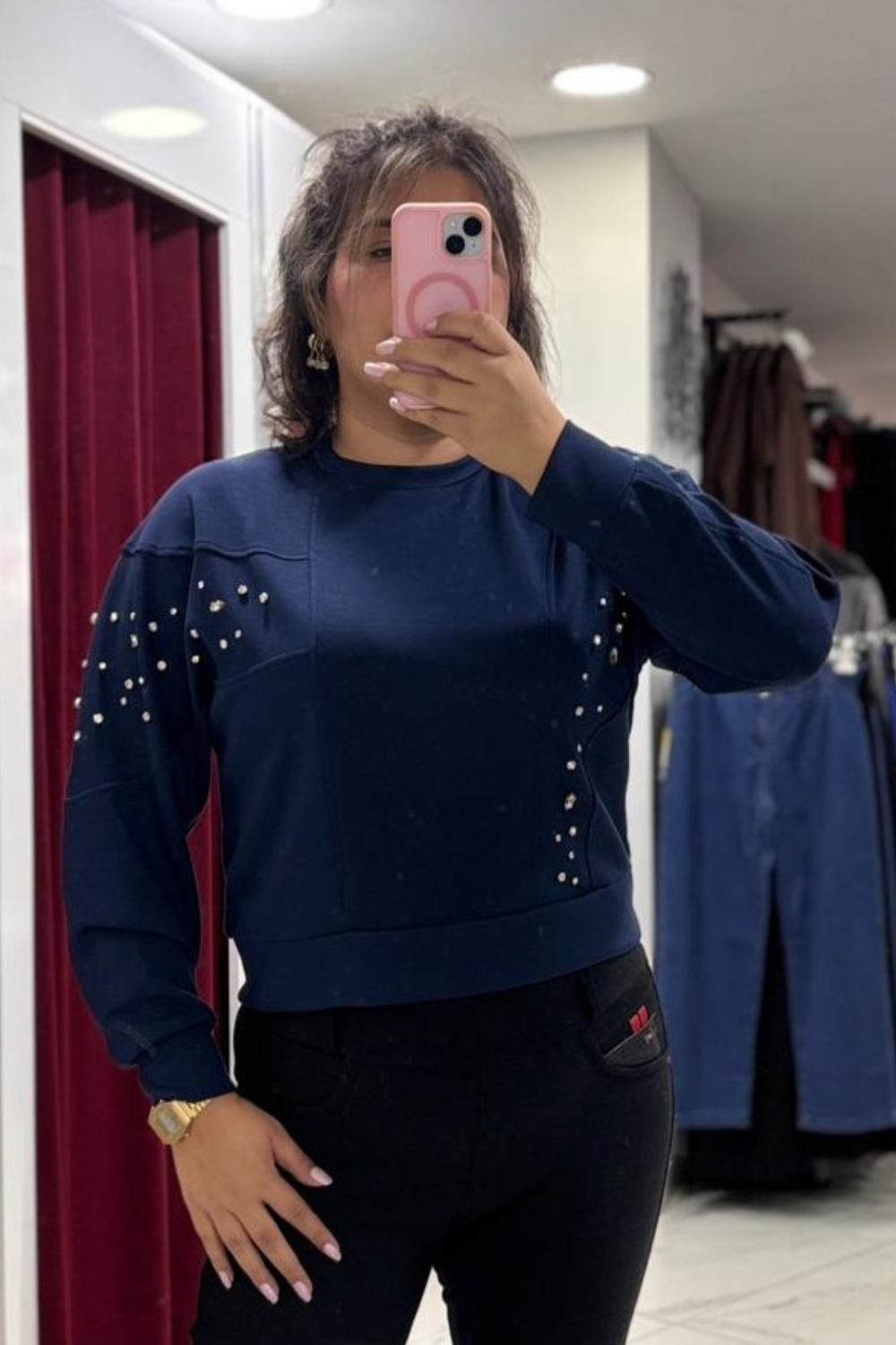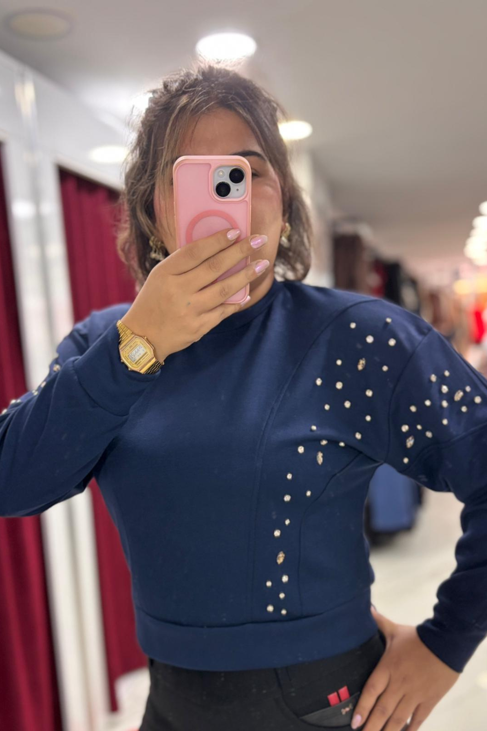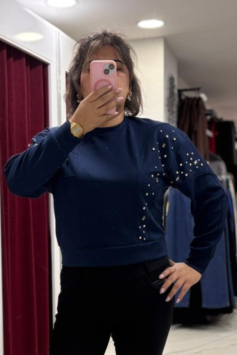 Zamansız lacivert tonuyla şıklığı ve rahatlığı bir arada sunan bu sweatshirt, omuz ve kol bölgesindeki taş detaylarıyla sade bir parçada zarafeti ön plana çıkarır. Günlük kullanımda hem konforlu hem göz alıcı bir görünüm sağlar.