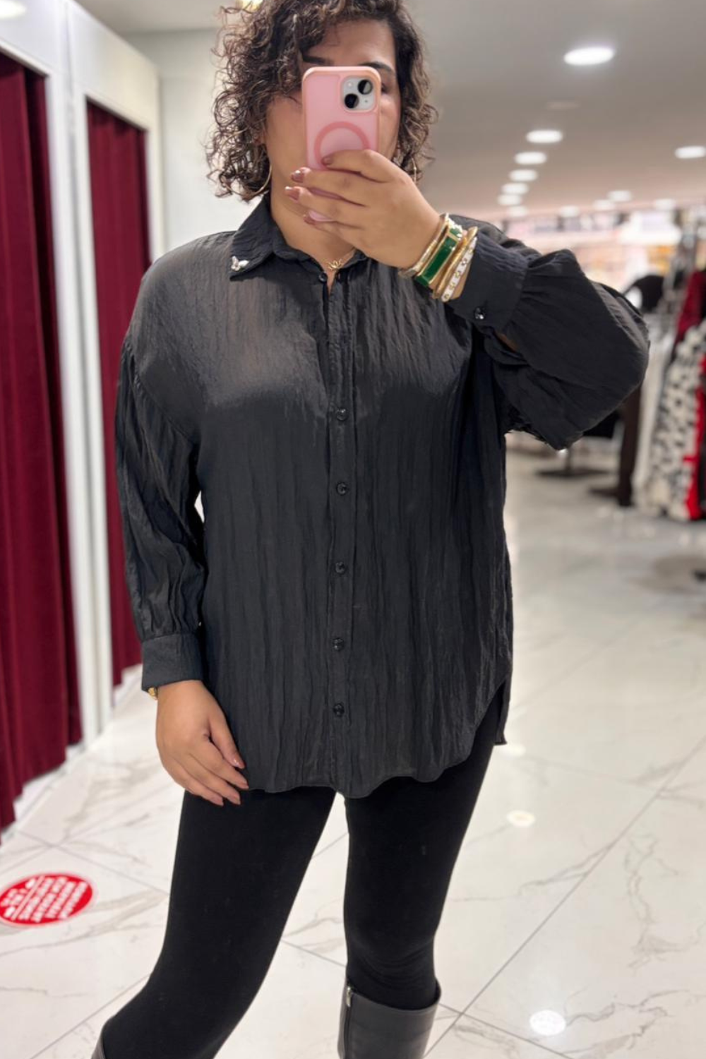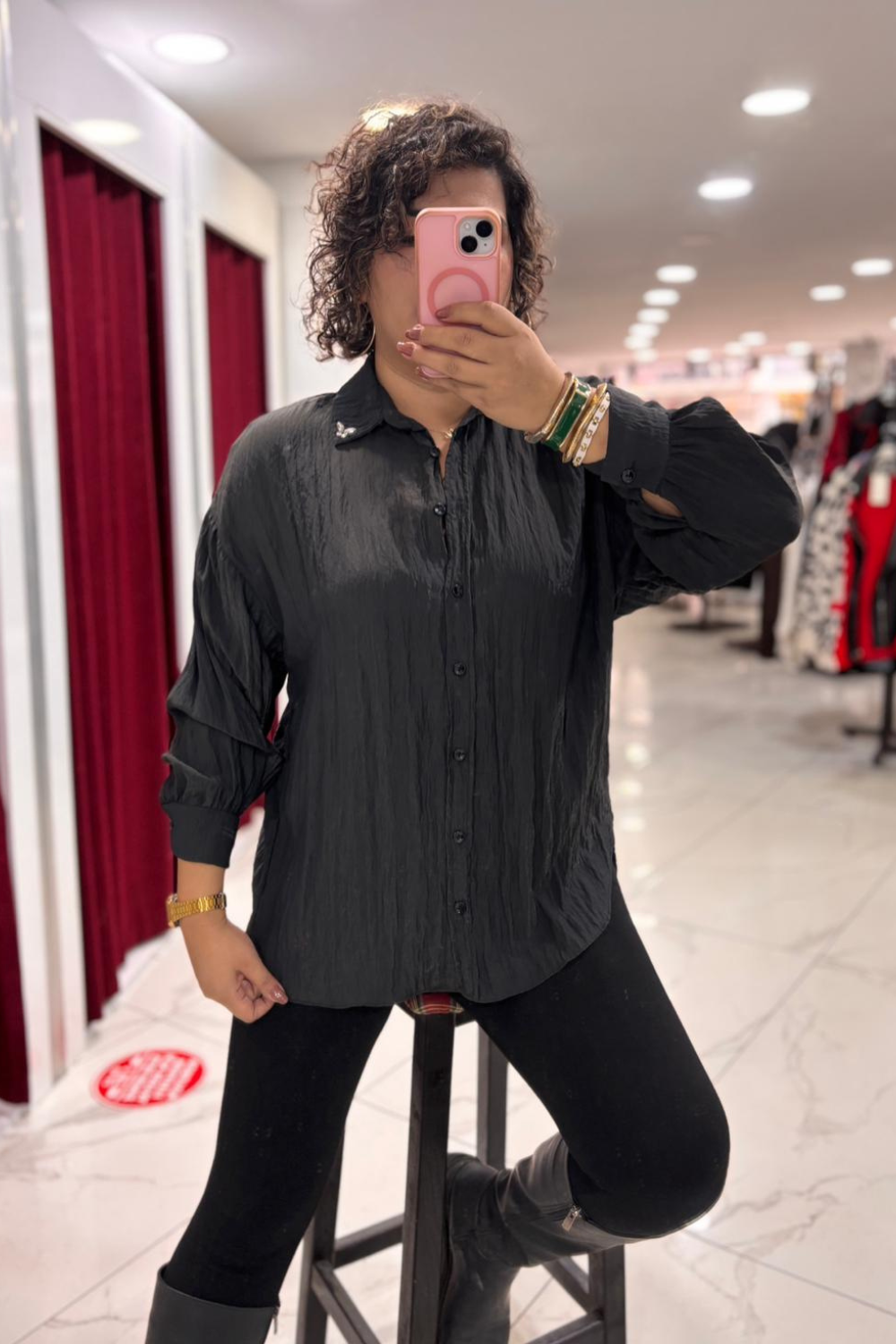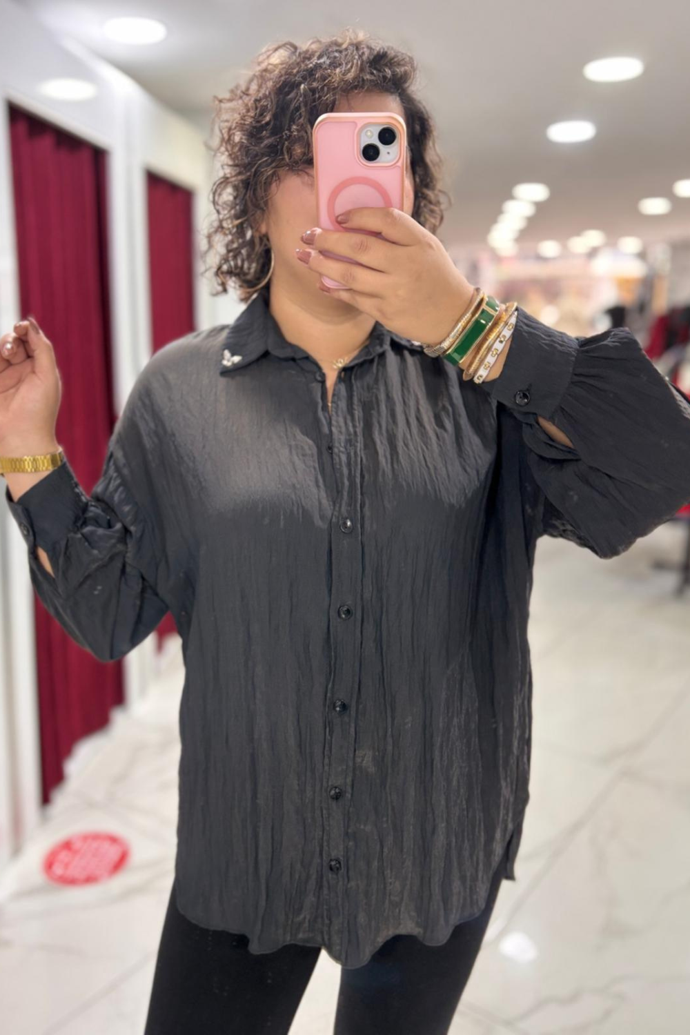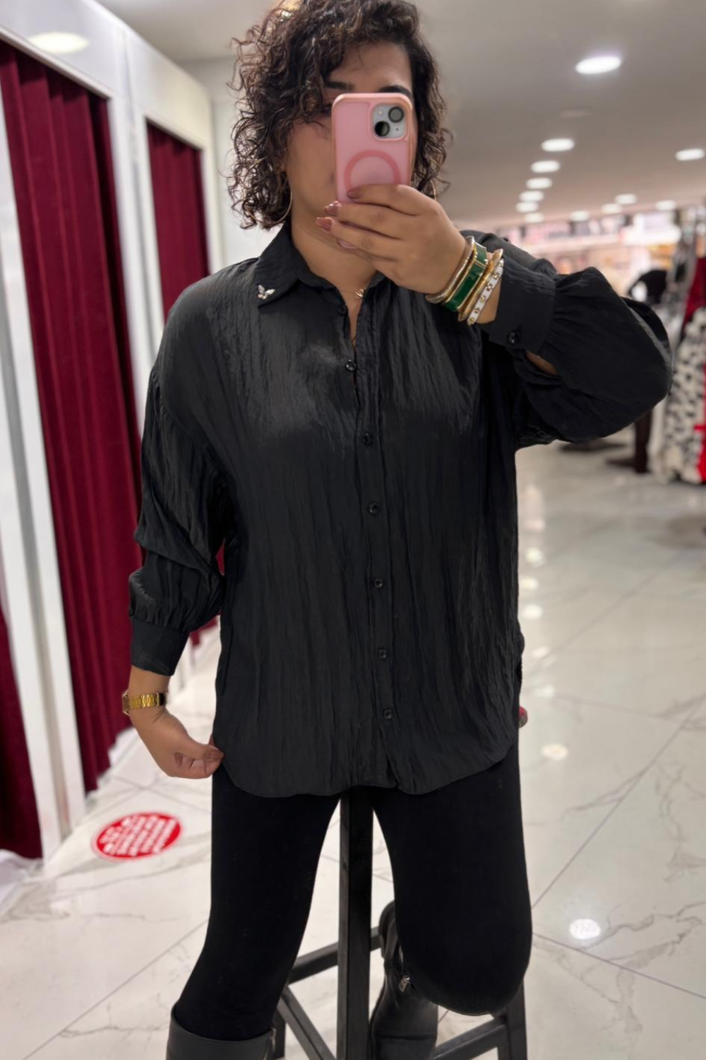 Modern dokusu ve rahat kalıbıyla stil sahibi görünümlerin tamamlayıcısı… Dökümlü yapısı ve hafif parlak yüzeyiyle her bedene uyum sağlayan bu siyah gömlek, sade ama iddialı bir şıklık sunar. Gömlek yaka tasarımı ve düşük omuz detayıyla hem klasik hem casual kombinlerde zarafet sağlar.