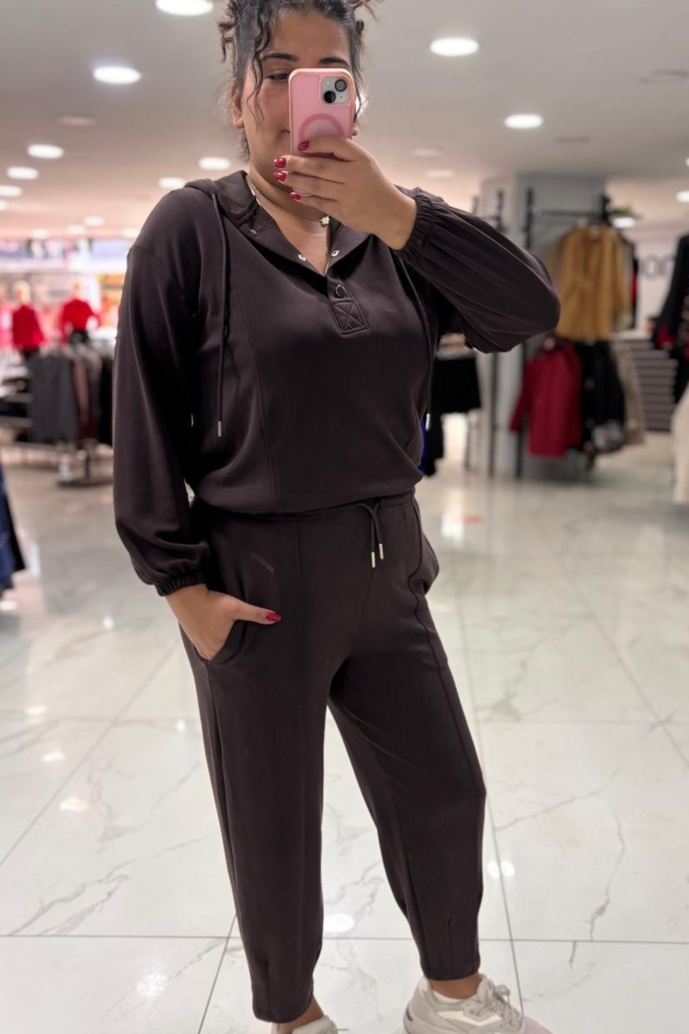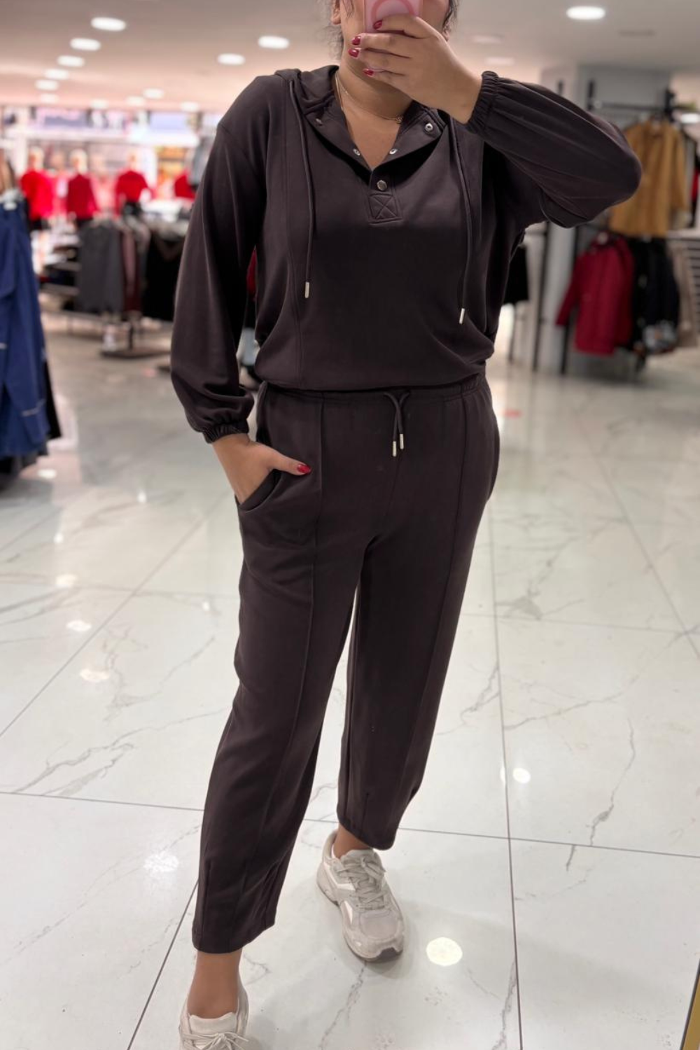 Detay: Ön düğme detayı, rahat kesim pantolon