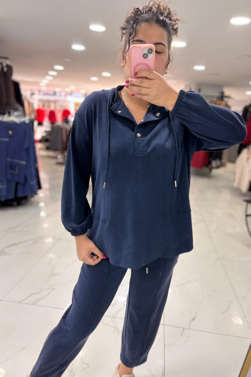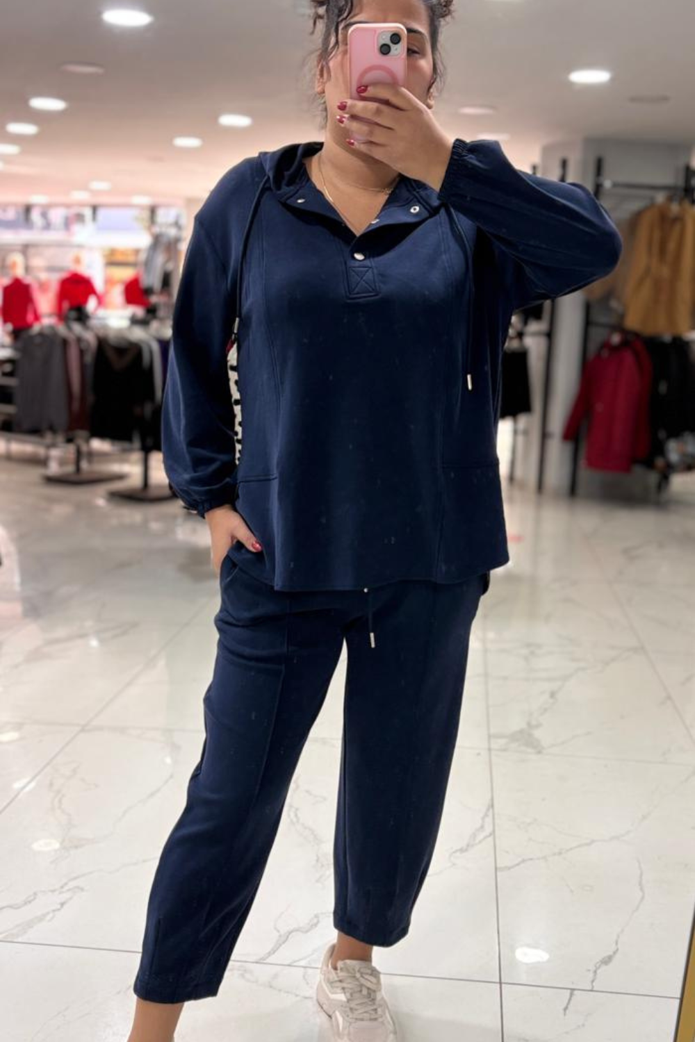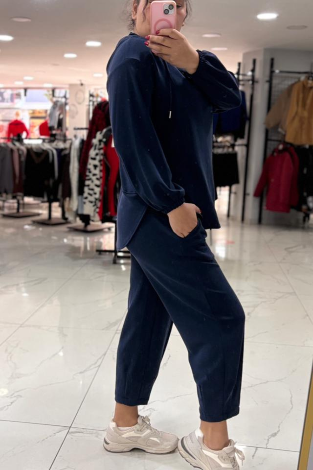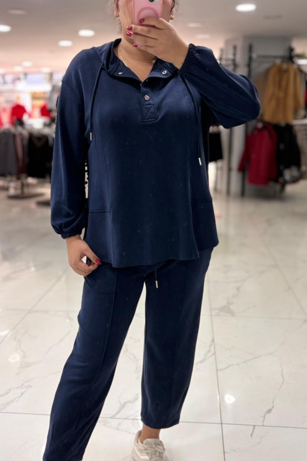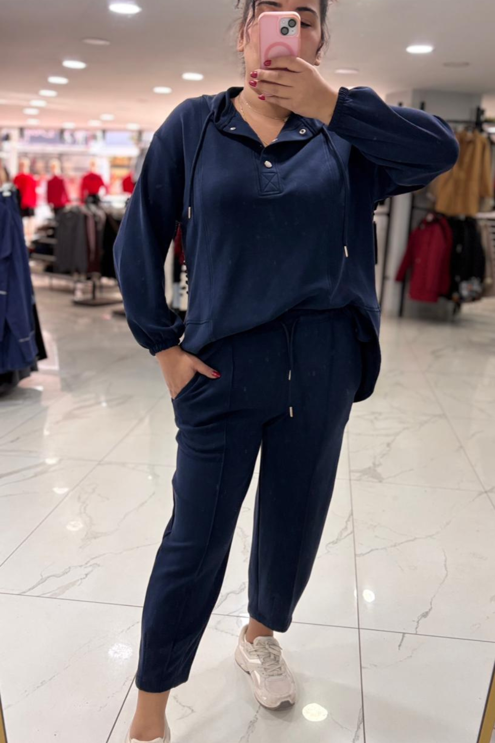 Detay: Ön düğme detayı, rahat kesim pantolon