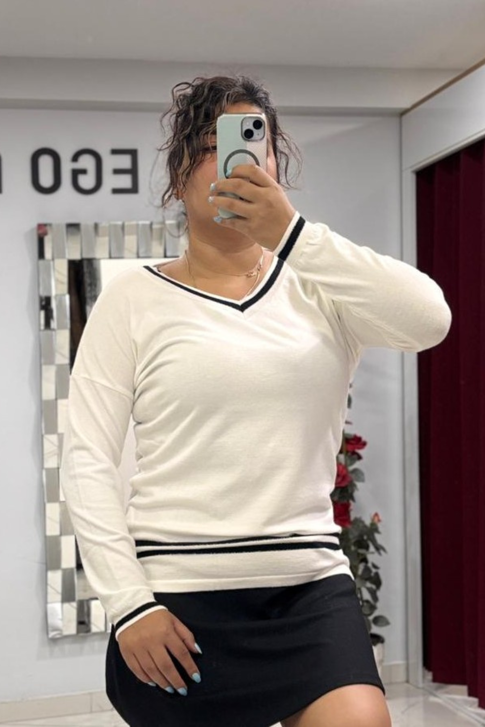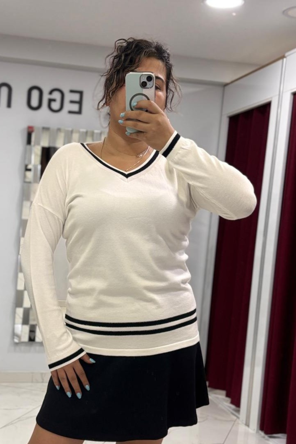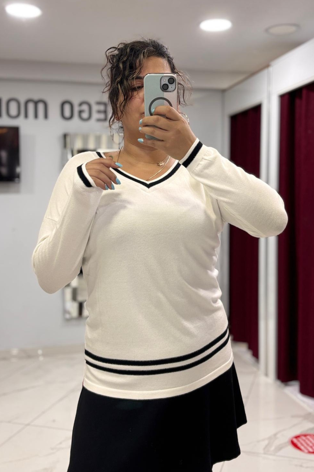 Detay: Yaka, bel ve kol uçlarında kontrast beyaz şerit detayı