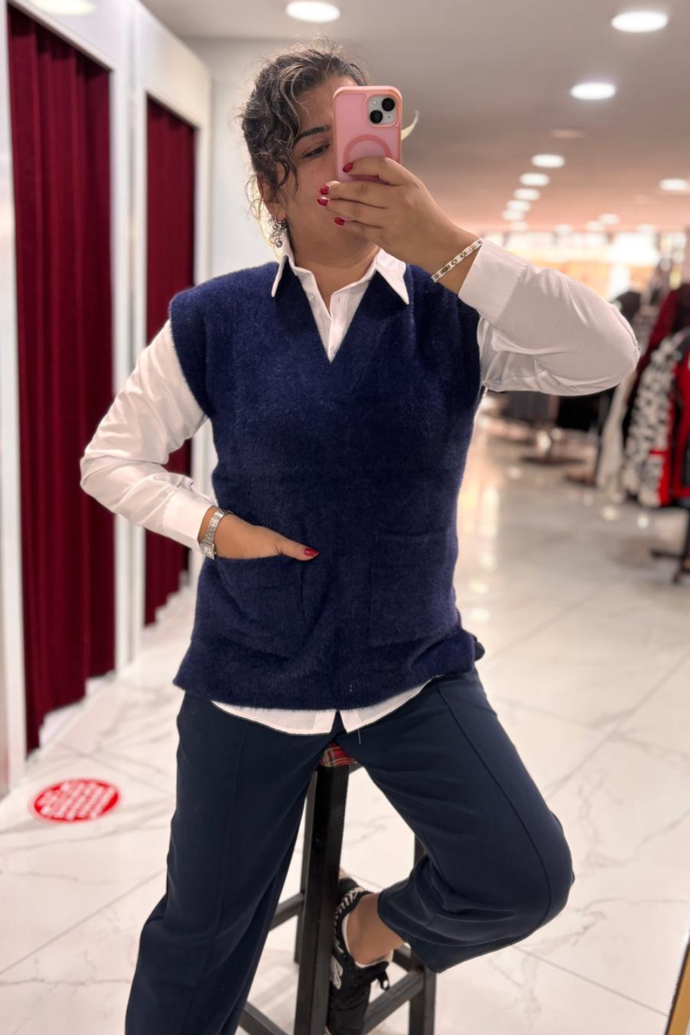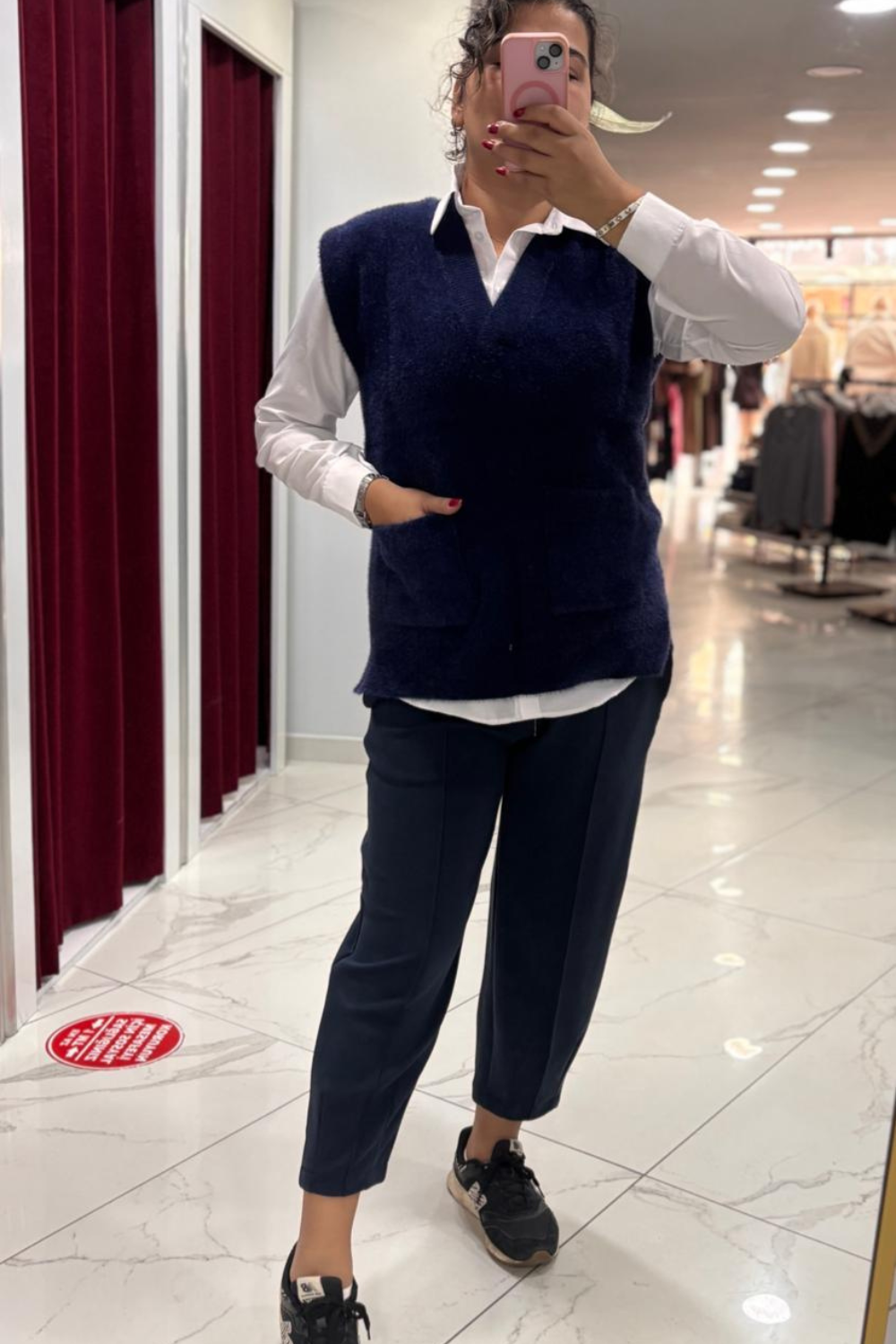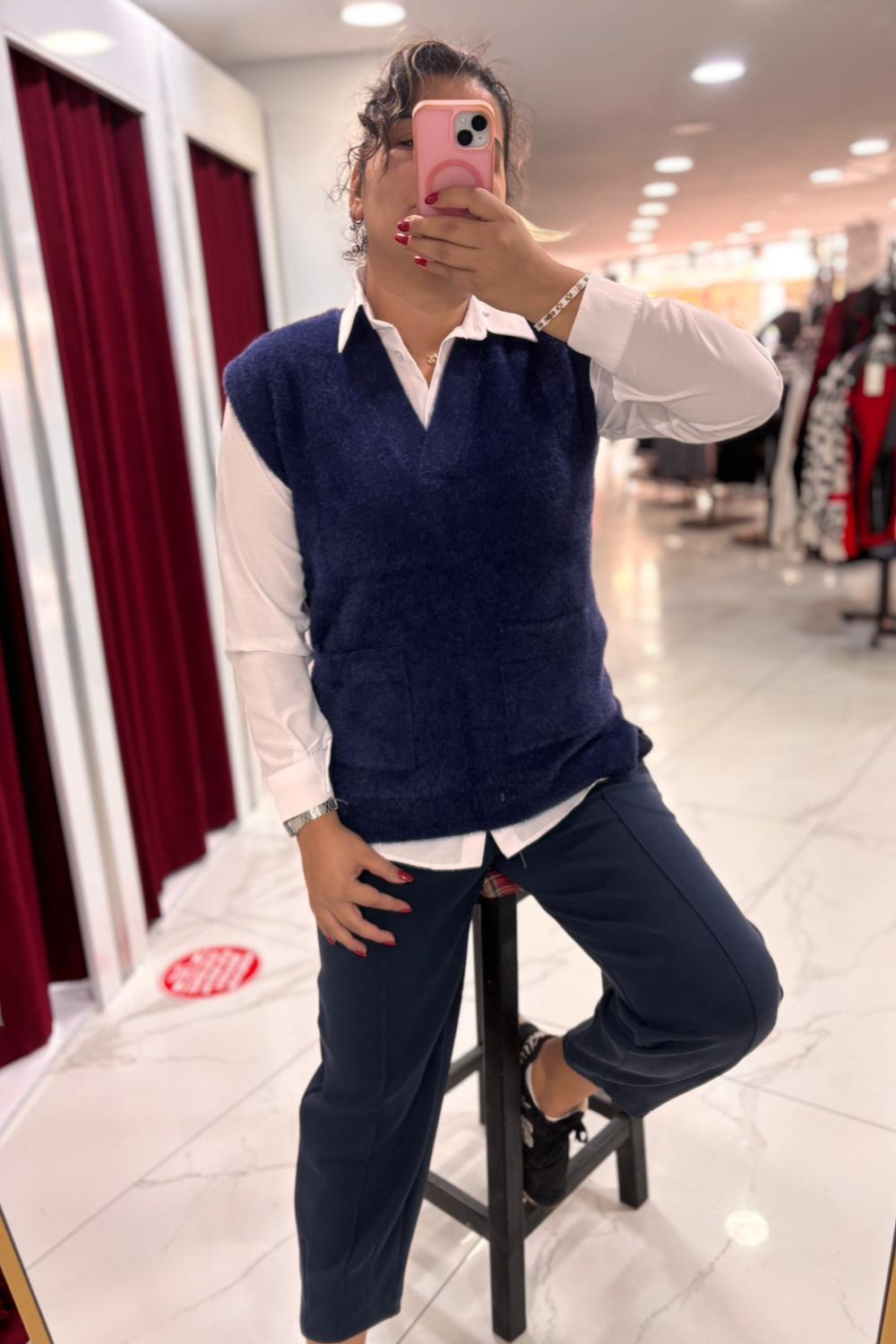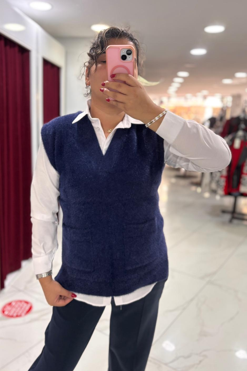 Koyu lacivertin asil tonunu, tay tüyü yumuşaklığıyla buluşturan bu oversize süveter, her kombinde zarif bir dokunuş yaratır. Sade ama etkileyici tarzıyla hem ofis şıklığında hem günlük kullanımda konforu ve stili bir arada sunar. Standart bedeniyle farklı vücut tiplerine kolayca uyum sağlar.
