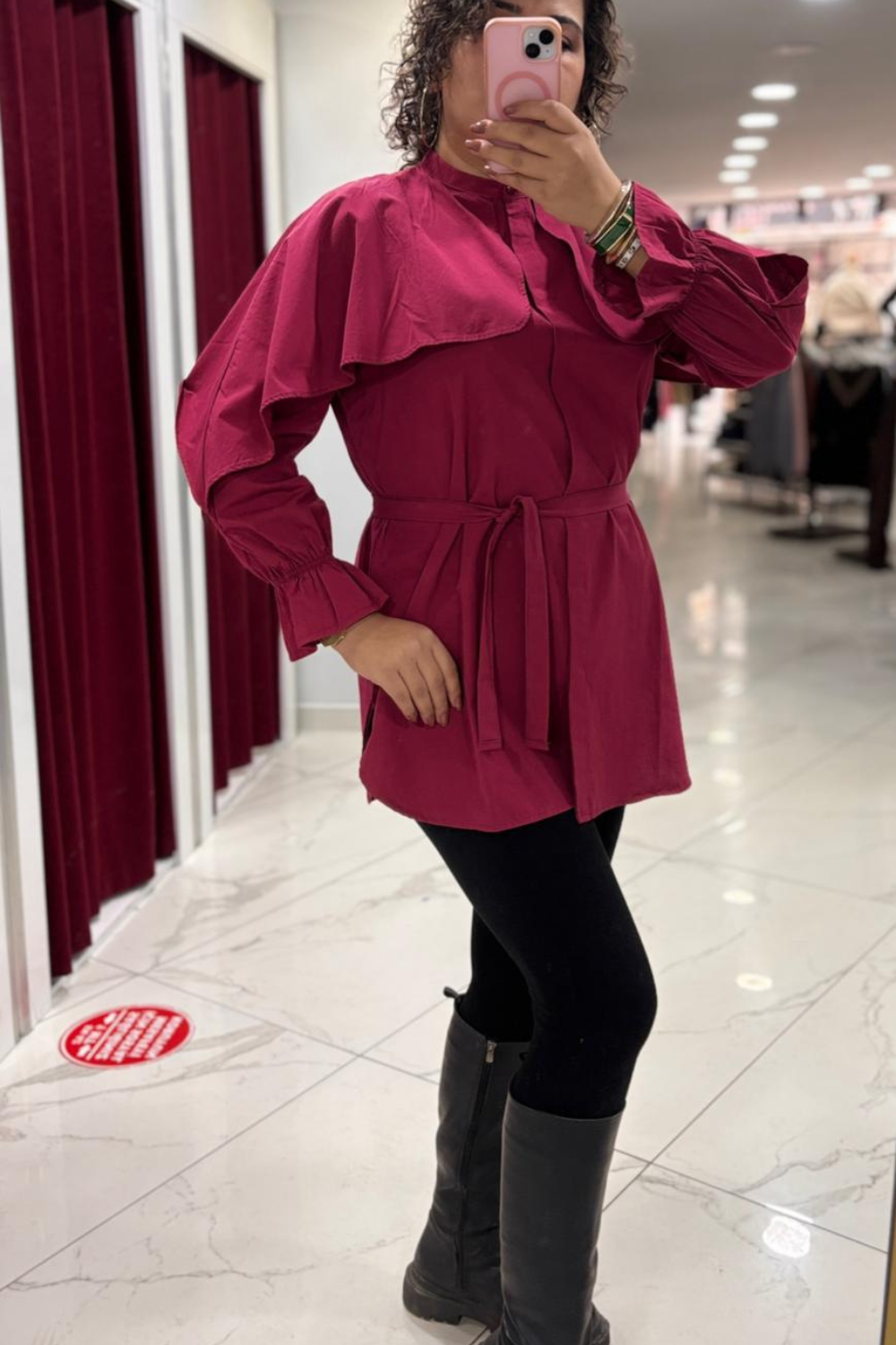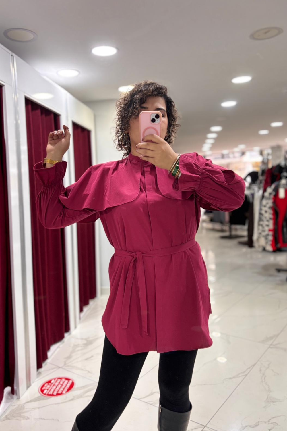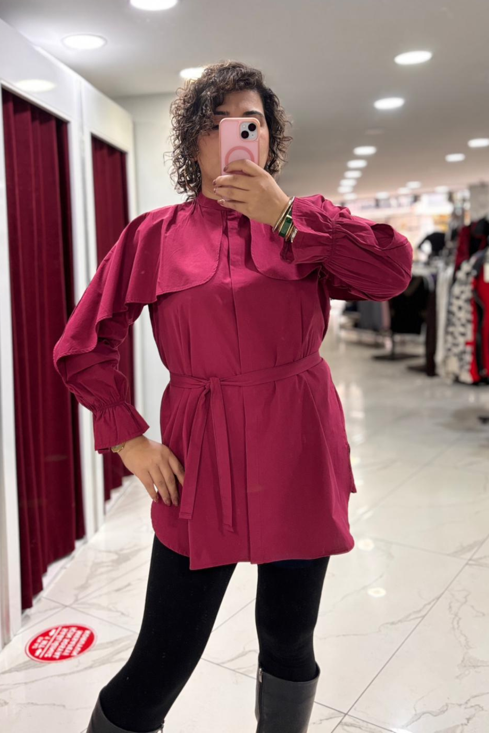 Fırfır detaylı tasarımı ve belden bağlamalı formu ile feminen şıklığı ön plana çıkaran bu tunik, hem rahat hem de zarif bir görünüm sunar. Yumuşak dokusu ve esnek yapısıyla günlük kullanımda konforu hissettirirken, dikkat çekici formu sayesinde özel kombinlerde de fark yaratır.